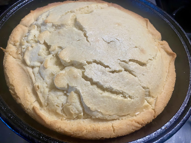 Pour batter into a hot iron skillet or 8X8 greased baking dish.